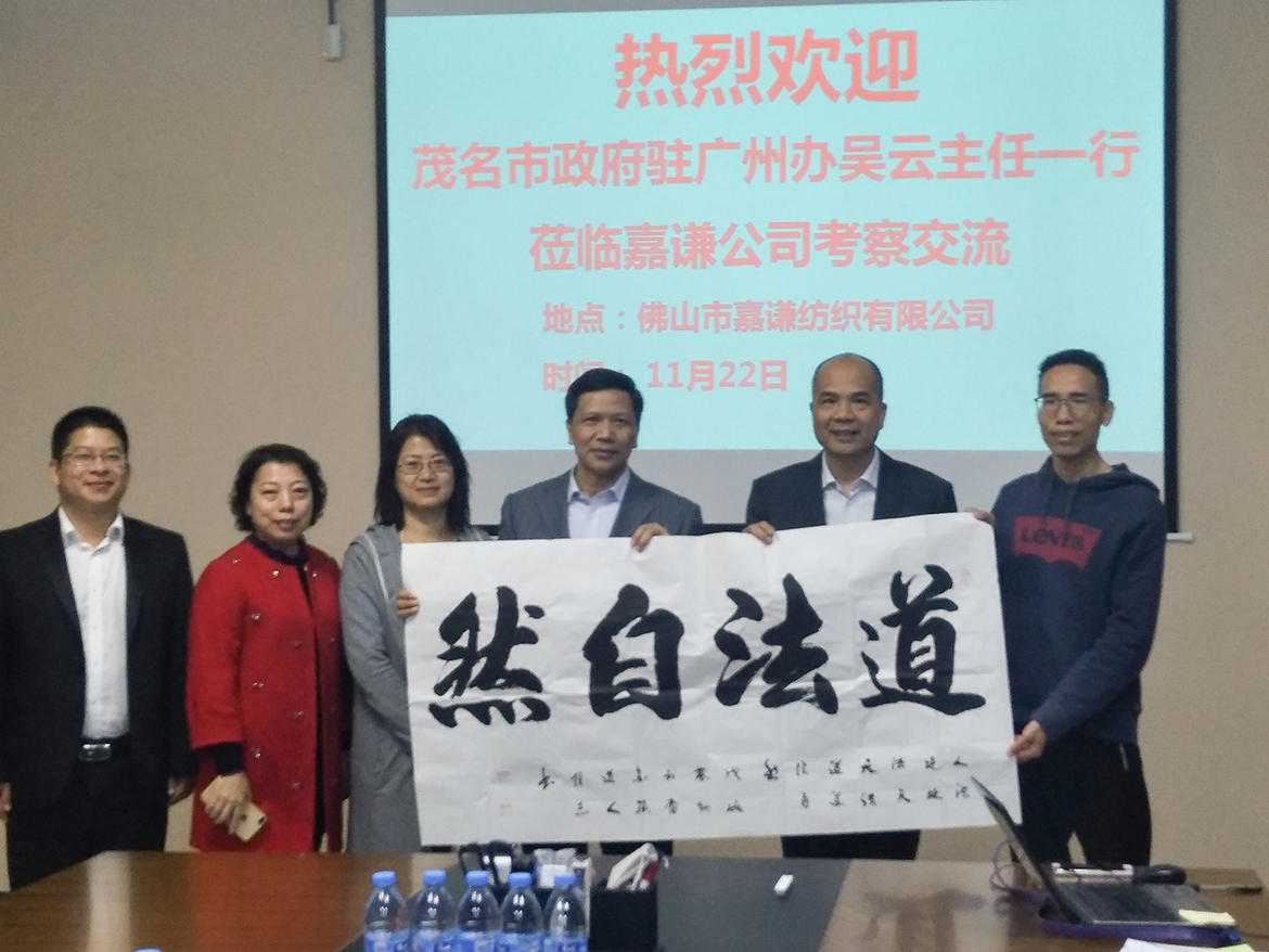 2018年11月22日下午佛山市嘉謙紡織有限公司迎來了茂名市政府駐廣州辦事處主任吳云一行進行考察指導。嘉謙公司董事長兼廣東省茂名商會常務會長蔡景輝、財務總監(jiān)魏文穗表示熱烈歡迎應并接待陪同。